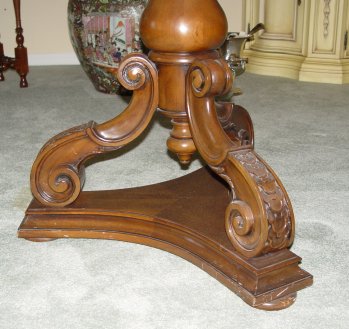 KARGES 11 FT DINING TABLE WITH 3 LEAVES: Oval table with banded top on double pedestal. With a width of 49'' and starting length of 76'', the table expands to 11'3'' with the three 16'' leaves. Karges name plate on the underside. An excellent conference table.