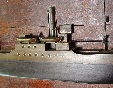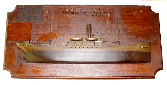 HISTORICAL FOLK ART 1/2 HULL MODEL SS PACHUTA: Ca 1919. Commemorating the first ship built by the Saginaw Shipbuilding Co. Mounted on oak. Approx. 37'' x 78''.