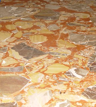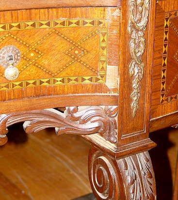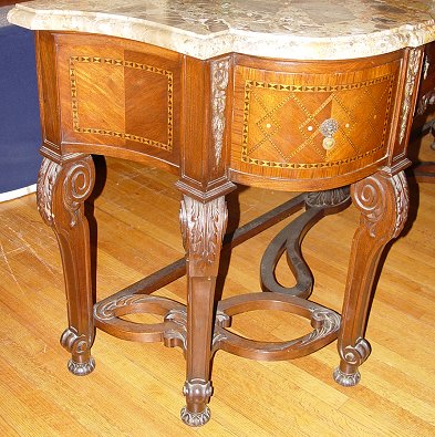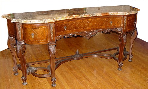 STUNNING ITALIAN PARQUETRY INLAY MARBLE TOP SIDEBOARD: The shape of the beveled marble top follows the lines of the inward curved center drawer and bowed side cabinets. Attractive parquetry inlay, elaborate curved stretchers connect six carved legs. Please note minor veneer loss 3'' repair to marble on corner. 37''h. x 24 1/2'' x 74''l.
