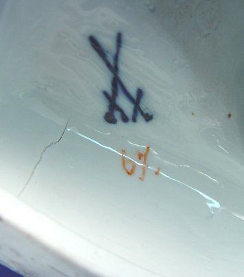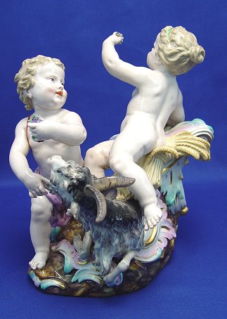 MEISSEN PORCELAIN CHERUB GROUP: Frolicking putti, goat, and sheaths of wheat. Blue under glaze cross sword mark, impressed numbers 1230 and red 67. Approx. 9''h. x 8'' x 5''. No cracks or chips, loss of grapes for one child.