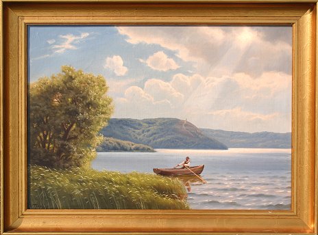 DREWES, Kaj, (Danish, 1884-1964): Lakeside with figure in boat, O/C, 19'' x 27'', signed lower left, original gilt frame, 23'' x 31''.