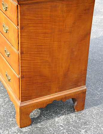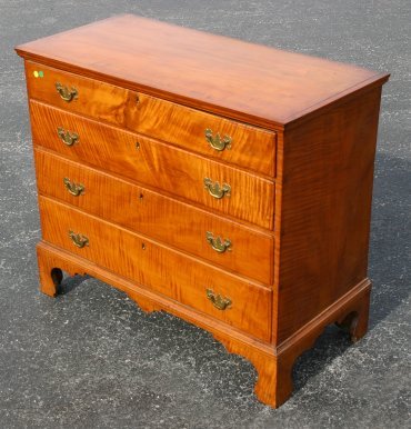 19th C CHIPPENDALE TIGER MAPLE CHEST OF DRAWERS: Slightly overhanging molded cornice, four drawers, shaped bracket feet and skirt. Dovetail construction, chamfered panel back, 34''h. x 39 1/2'' x 19 1/2''.