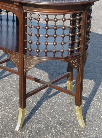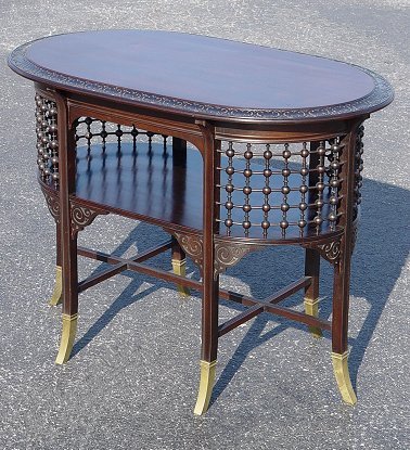 UNUSUAL & RARE VICTORIAN MAHOGANY STICK & BALL TABLE: Oval in shape with carved rim, two tiers, brass caps on the feet. 30''h. x 40'' x 24 1/2''.