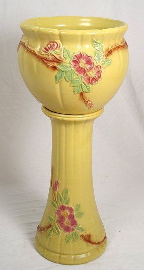 ROBINSON RANSBOTTOM RRP & CO. POTTERY JARDINIERE AND PEDESTAL FROM ROSEVILLE OHIO: Raised flower design. Crazed interior. Jar is 13'' dia. pedestal is 21''h, the two together are 31 1/2''h. .