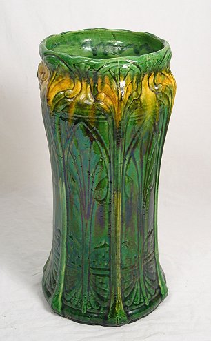 EARLY 20TH C MAJOLICA GLAZE ART POTTERY UMBRELLA STAND: Green and brown glaze over an Art Nouveau design. 32''h. No chips or cracks.