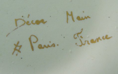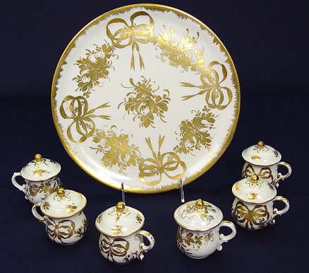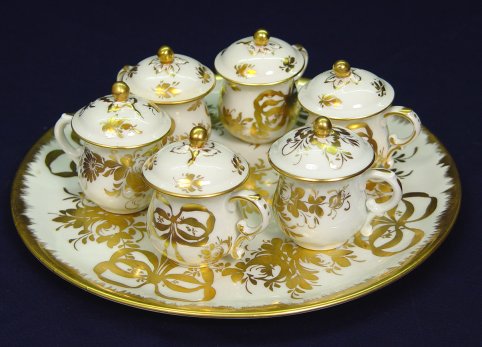 FRENCH LIMOGES POTS DE CREME WITH TRAY: Hand painted in a gold ribbon motif. 4 of the pots bear the mark of Pillivuyt, ca. 1913-1936. Two of the pots are painted in a slightly different pattern bear the mark of Mehun?, also French. The 11 3/4'' tray has hand written message on the underside translated to Hand decorated Paris France.