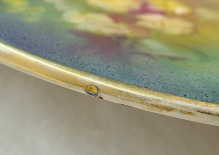 PAIR OF COLOSSAL FRANZ ANTON MEHLEM HAND PAINTED CHARGERS: Large as life, each of hand painted earthenware chargers is 19 1/2'' dia. Ca. pre 1920, Bonn, Germany. One bears the impressed hallmark of Mehlem, the other the CG impression.