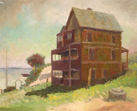 AKED, Aleen, (Canadian/American, 1907-2003): Sarasota coastal view with home, O/CB, 16'' x 20'', estate stamp verso, unframed. Condition- Needs cleaning, several flecks of paint loss and abrasions, overall good.