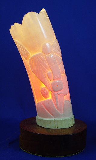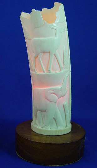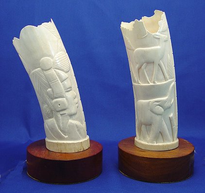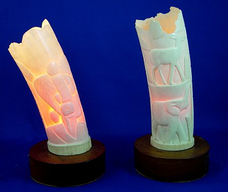 PAIR OF CARVED IVORY TUSK VASES ON WOODEN BASES: Elecrified as lamps. Elephants and African animals adorn the exterior. Senegal, early 20th C. 10 1/2''H. overall. Please note chippage along upper rim.