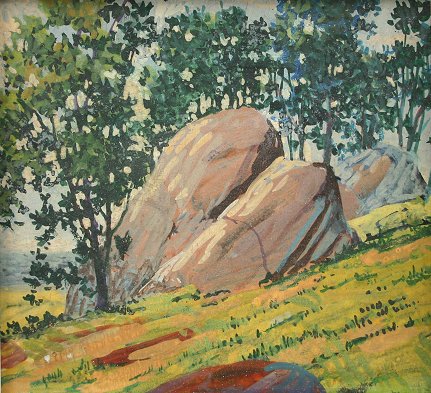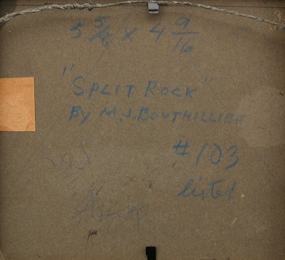BOUTHILLIER, M.J., (American, 20th C): Pair of Oils/Panel. The first piece is titled ''Red Rock, Marblehead, Mass.'', 5'' x 5 3/4'', and the second is titled ''Split Rock'', 5 5/8'' x 4 9/16'', they are both signed, Red Rock is signed lower left, both pieces are signed verso and encased in custom worn frames.