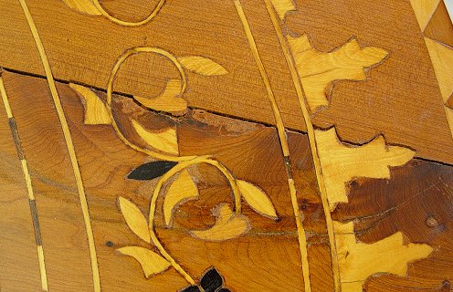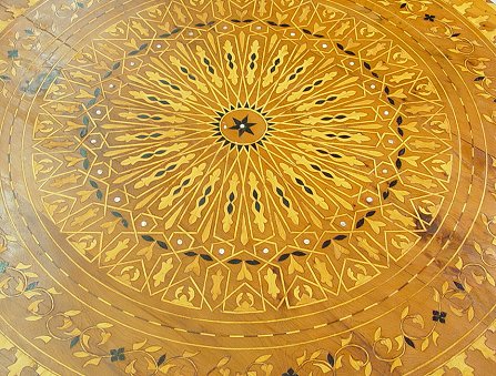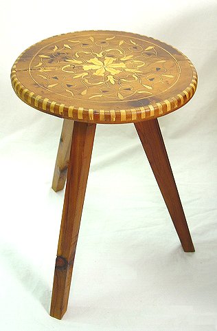 FROM ESSAOURIA MOROCCO- A CEDAR INLAID COCKTAIL TABLE: Intricate star pattern, glass top. SOLD WITH a pair of inlaid stools or side tables. The larger table is 19''h., 35 1/2'' dia. The side table are 7''h., 12'' dia.