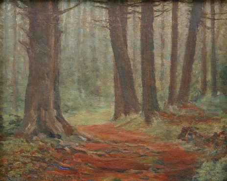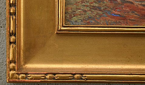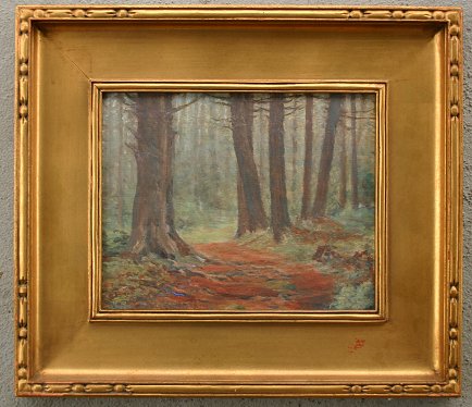 KINKEAD, Charles Edwin, (American, 20th C): ''Fag In The Woods'', Gouache, 8'' x 10'', signed lower left, encased in original arts and crafts/impressionist carved and gilded molding with some wear and missing gilt, 13 3/4'' x 15 1/2''.