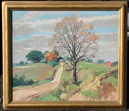 WILDER, Thomas, (American, 1876-): ''Over The Hill'', O/C, 17 1/4'' x 20 1/4'', signed lower right, dated '33, exhibition labels affixed verso, original price tag, also faint paper label lower left corner, encased in a period carved gold overpainted molding, 20 1/4'' x 23 1/2. Condition - Very minor craquelure, will need cleaning.