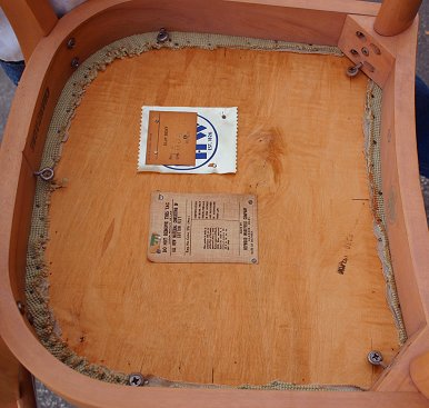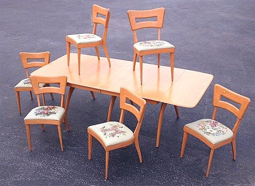 HEYWOOOD WAKEFIELD MODERN TABLE WITH 6 CHAIRS: M197G Pedestal drop-leaf extension table with butterfly supports. Two 18'' leaves. Top is 40'' x 26'' closed. Open to a full 94''l with extension leaves in place, 58'' with drop leaves only. SOLD WITH set of 6 M154A side chairs with needlepoint seats. Chairs bear the eagle mark and cloth tags. Champagne finish is in good condition.