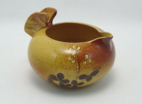 ROOKWOOD POTTERY CREAMER: Designed by William Watts Taylor. shape 329, butterfly handle creamer. Flowers on high gloss yellow and brown. RP mark, dated 1887. No chips or cracks. 2 1/2''h. x 4 1/2''w.