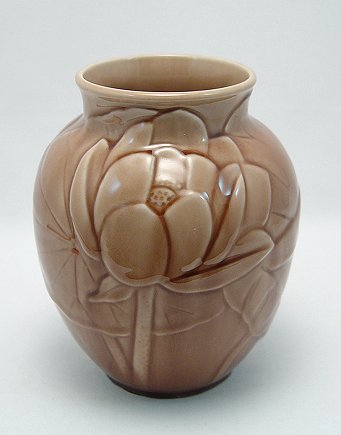 ROOKWOOD POTTERY VASE 6833: Molded water lily design, brown high glaze, shape 6833, RP mark, dated 1950. No chips or cracks. 6 1/2''h.
