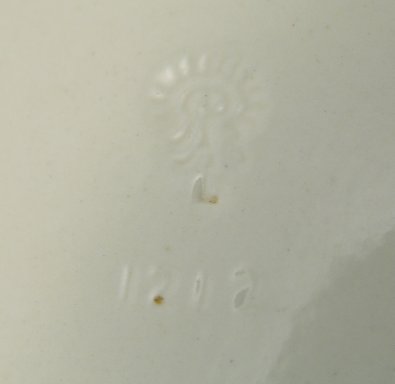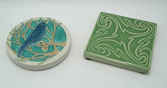 TWO ROOKWOOD POTTERY TRIVETS: Round trivet 2349, matte decorated with blue Rook bird in tree on white ground, RP mark dated 1921. 2349, 6'' dia. The second is a light green with swirl, high glaze finish, RP mark, dated 1950, shape 1212, 5 3/4 square.