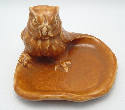 ROOKWOOD POTTERY OWL PAPERWEIGHT TRAY: Shape 1084, brown matte, RP mark, dated 1939. No chips or cracks, 4''h, x 6 1/2''w.