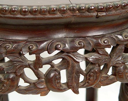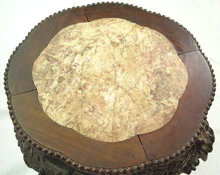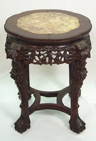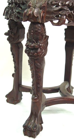 CARVED ORIENTAL MARBLE TOP TABLE: Shaped top with beaded edge, centered by an inset of variegated marble, four legs start in scaled dragon heads and end in ball and claw feet, shaped stretchers, 22 3/4''h., 18''top, 23''dia. to dragon heads.