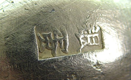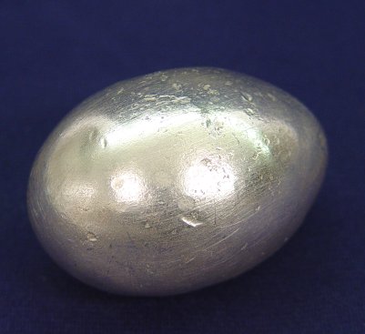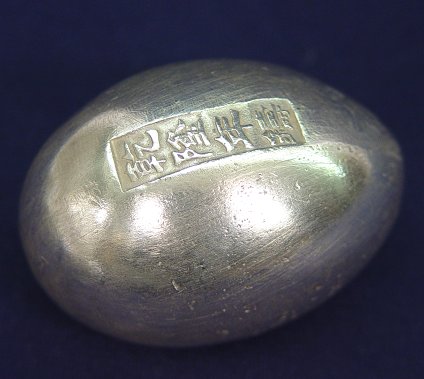 CHINESE SILVER EGG INGOT SYCEE: Approx. 19 oz of silver in an egg shaped ingot, purported 19th C Qing Dynasty, actual age unknown, two character mark to one side and four character mark to other. Est. $200/300**