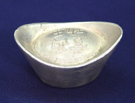 CHINESE ''REWARD'' SYCEE INGOT: Silver ingot used as a reward for some powerful Minister from the Emperor, purported 19th C, actual age unknown. Approx. 14 oz., four character mark to base. Est. $150/200**