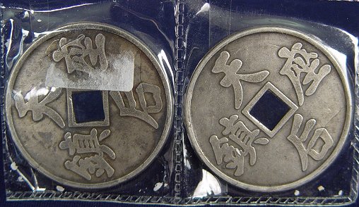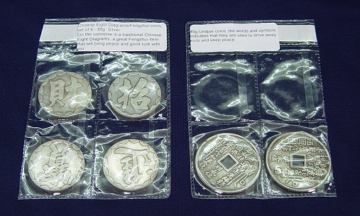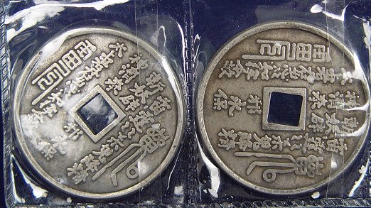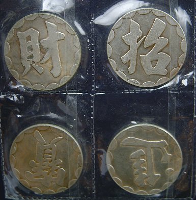 6 CHINESE SILVER COINS: Set of four fengshui coins to bring peace and good luck and two with symbols to drive away evils and keep peace. Est. $150/250**