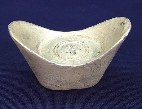 CHINESE ''LONGEVITY'' SILVER INGOT SYCEE: Silver ingot of approx. 13oz, purported 19th C actual age unknown. Est. $100/150**