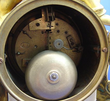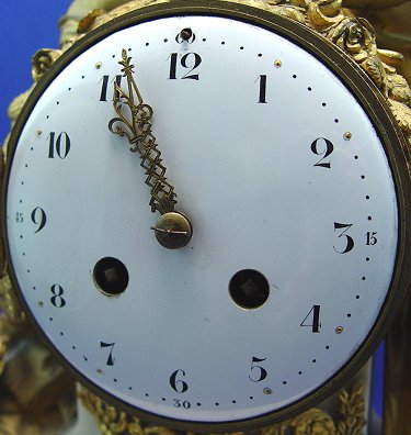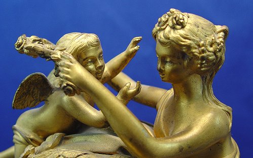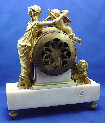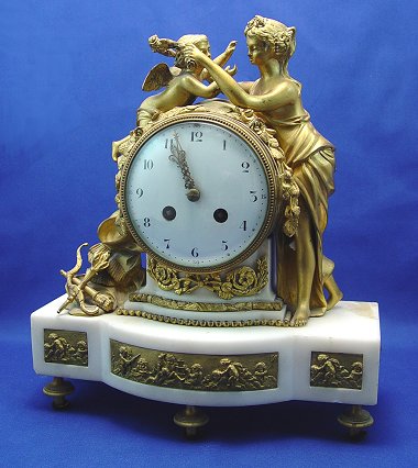 JAPY FRERES DORE BRONZE FIGURAL CLOCK: White marble case with dore figure of Venus and Cupid. Enamel dial, brass gong strike movement. 13''h x 10 3/4''.