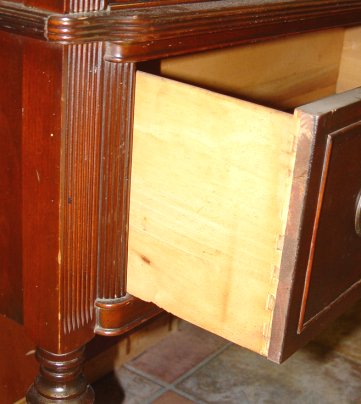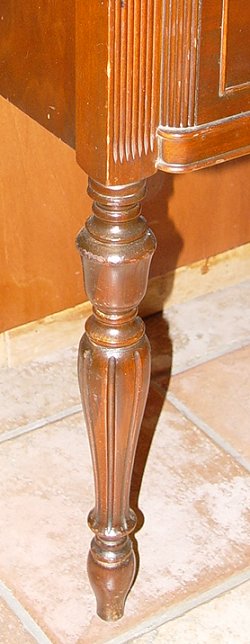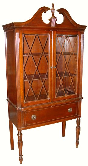GLASS FRONT MAHOGANY CHINA CABINET BY TROGDON OF TOCOA GA: Two door cabinet with glass inserts and fretwork doors opening to reveal two shelves. Broken pediment with center finial, flanked by ribbed side columns, over a single deep drawer. Raised on four legs front two of which are turned. 74''h. x 36''w. x 17''d.