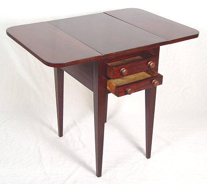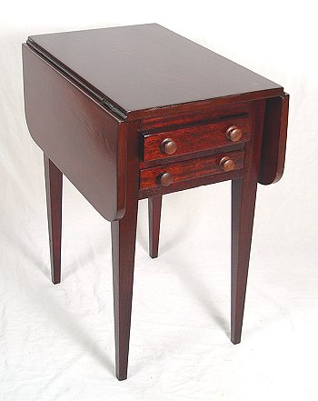 EARLY MAHOGANY DOUBLE DROP LEAF WORK STAND: Two drawers, tapered straight legs. Pegged construction. Refinished condition. 24''h. x 15 1/2'' x 24'' with leaves down. With leaves extended, 24'' x 35''.