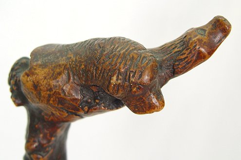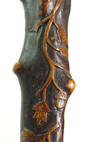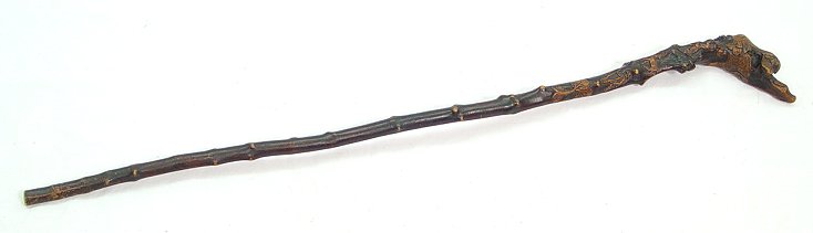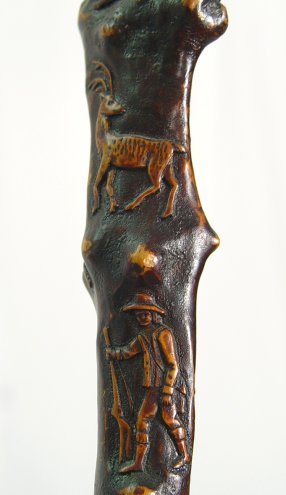 CARVED WALKING STICK: Single branch carved with a wooded scene of hunter and deer, handle in the form of two dog heads, approx. 36''.