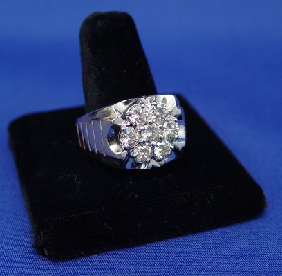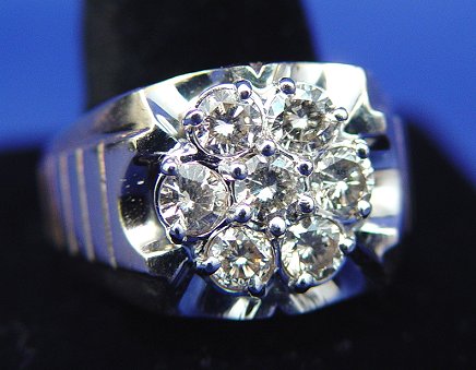 GENTLEMAN'S 2CTW DIAMOND RING: Seven round cut diamonds prong set in white gold on the white gold fluted top of a yellow gold man's ring. Marked 14k, size 12.75, approx. 10 grams. Est. $750/900**