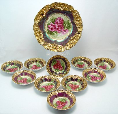 BAVARIAN PORCELAIN BERRY SET: Heavy with gilt ornamentation. Molded Art Nouveau floral border centers the rose decorated bowl. Some wear to the gold. Master bowl, 10 3/4'' dia., and 10 individual bowls.