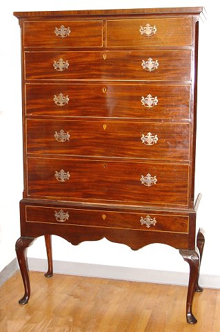 QUEEN ANNE CHEST ON STAND: Mahogany case. Period 6 drawer upper cabinet. Base not as old as the top nor is it original to the top. However it sure looks good together. Approx. 76'' x 45'' x 20''.