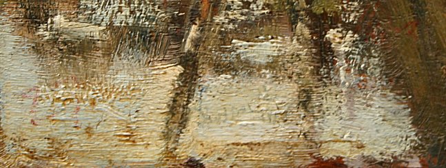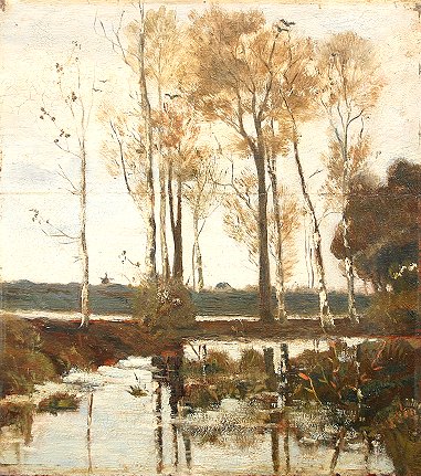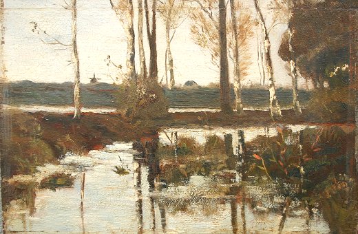 19TH CENTURY BARBIZON SCHOOL OIL/WOOD PANEL MARSH SCENE: Stand of poplars with windmill in the distance, 12 5/8'' x 11 1/2'', illegibly signed lower right, unframed. Condition - Needs cleaning, repair to board will need some infill, minor craquelure throughout. Est. $1500/2500**