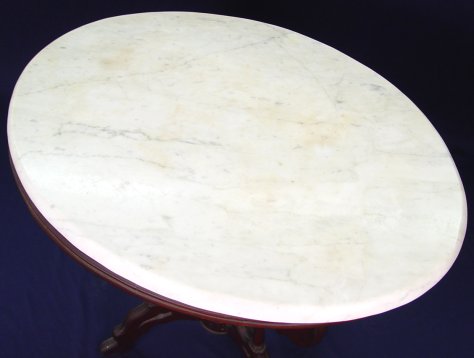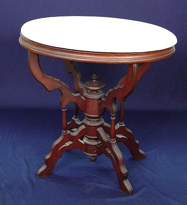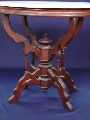 EASTLAKE VICTORIAN MARBLE TOP SIDE TABLE: Oval top of white variegated marble on intricate shaped, pierced and finialed four legged walnut base, 26 1/2'' x 27'' x 19 1/2''.