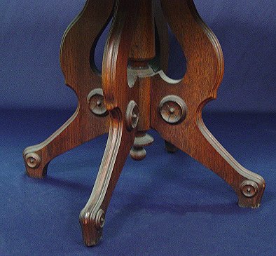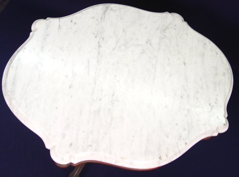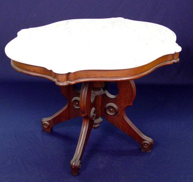 EASTLAKE VICTORIAN TURTLE BACK MARBLE TOP TABLE: Molded and shaped marble top of variegated white marble, on a like shaped walnut base with altered height, 21'' x 30 1/2'' x 24 1/2''.