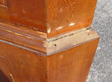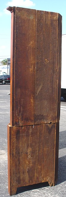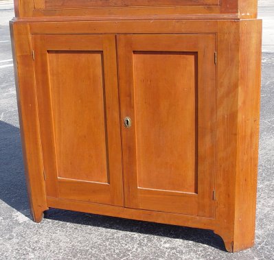 19TH C CHERRY CORNER CABINET: Two part cabinet with upper section having overhanging molded cornice, 12 panes of old glass divided by wood muntins (2 panes cracked), painted interior with plate rails. Lower section has cabinet doors, interior shelf, straight skirt, bracket feet. Please note a small 3'' section of molding is missing on lower section. Approx. 88 1/2''h. x 41'' across front, 25'' sides.