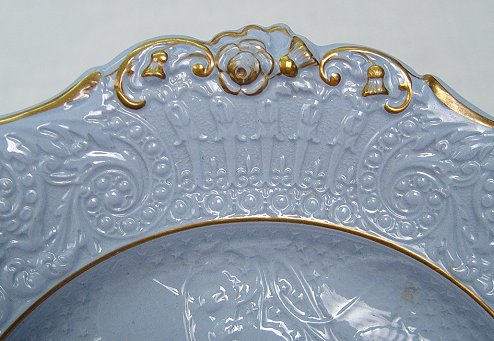 19th C SOFT PASTE PLATES AND TUREEN: Possibly Bennington. Molded floral and foliate design on sauce tureen, 7''h., platter, 12''l, and three plates, 9'' dia. Minor discoloration.