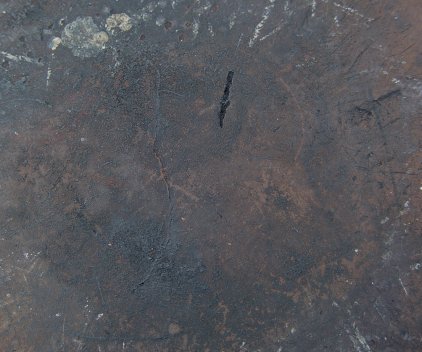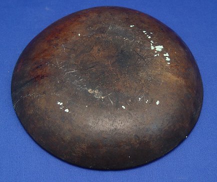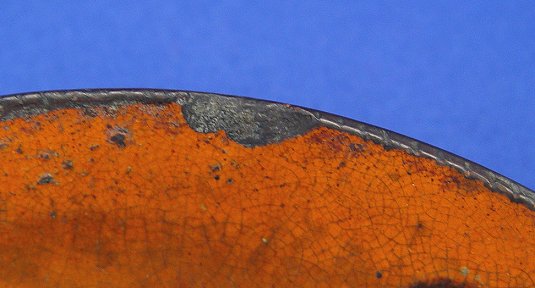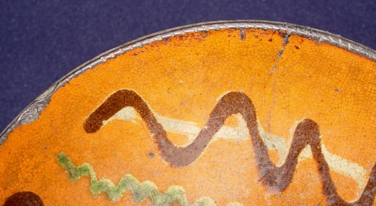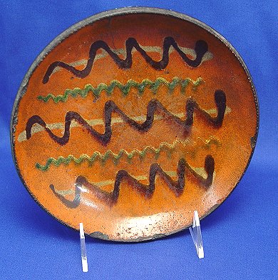 SLIP DECORATED REDWARE PIE PLATE: Slightly coggled rim. Surface wear. 7 1/2'' dia.