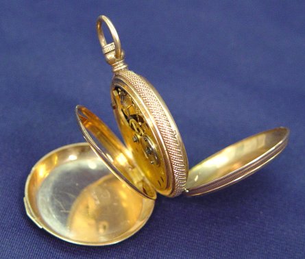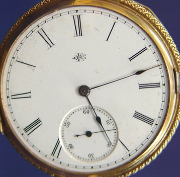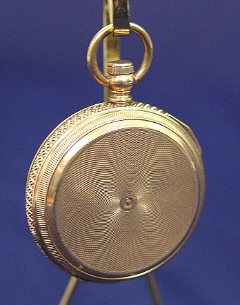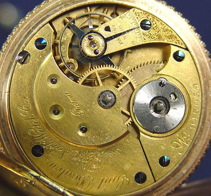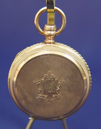 ELGIN GAIL BORDEN GOLD POCKET WATCH: Key wind pocket watch, with key, in gold hunt case. Works marked Gail Borden Elgin National Watch Co. serial # 946069. Hunt case with overall wheel etched design and monogrammed shield MCC?. Case marked B.&T., symbol of bird with outstretched wings, 13882 and shield with wings beside hour glass. I can't place the mark in book, assays as 14k, no noted wear as if gold filled but you decide. Currently keeping time.