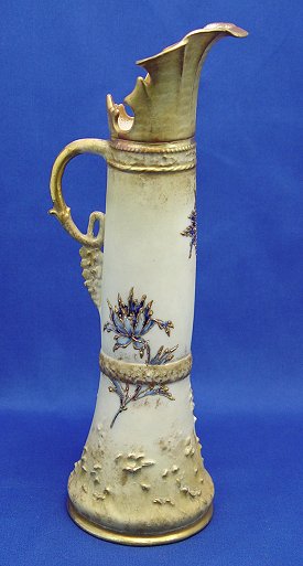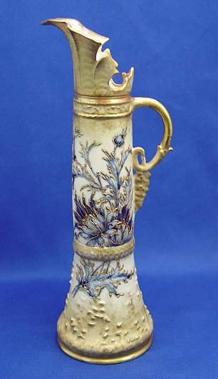 WORCESTER RICHLY ENAMELED TALL PITCHER: Unusual tall narrow pitcher with thick cobalt and blue enameling. Unsigned. 11''h.