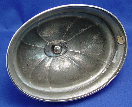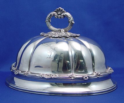 SILVER PLATE MEAT DOME: Engraved with a deer head design, loop handle, cross hatch hallmark?. 11''l, x 7 1/2''h.