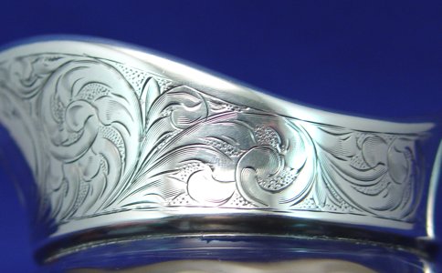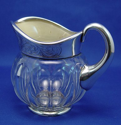 HEISEY ''PURITAN'' STERLING OVERLAY SQUAT PITCHER: Heavy sterling over the upper rim and a band at the base (the base has chips under the silver). Monogrammed. 5''h.