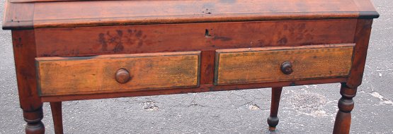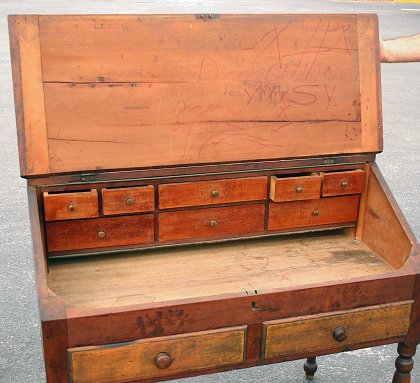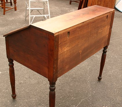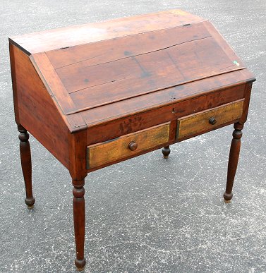 19TH C PENNSYLVANIA LIFT TOP DESK: American country lift top desk with interior open storage and cubicles. Two half length drawers. Turned legs. Worn condition. 37 1/2'' x 40'' x 24''.