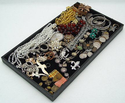 LOT OF ESTATE JEWELRY: To include, sterling bracelets by Danecraft; copper cuff and foliate butterfly pin; Danecraft crab pin; charms; coin bracelets; Breiz Bepred bracelet; large silver locket; faceted bead necklaces - continuous amber, 60'', double clear and white with sterling clasp, 55'', clear on chain needs clasp, 16''; scarab bracelet; crown pin and bracelet; rhinestone items; Coro flower clip earrings; metals and service pins; etc. Sold as a lot.