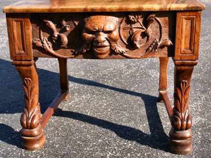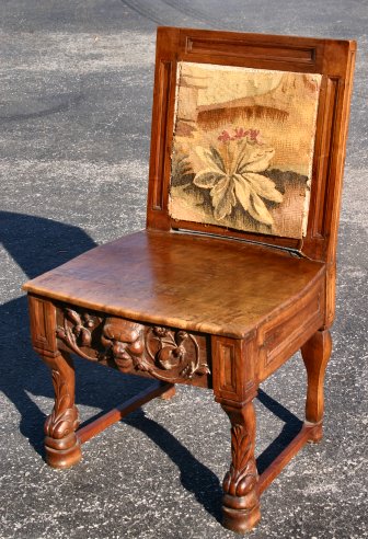 LATE 19TH C ITALIAN WALNUT SIDE CHAIR: Ornately carved, tapestry upholstered back inset in walnut. Whimsical yet sturdy, a great stand alone chair.
