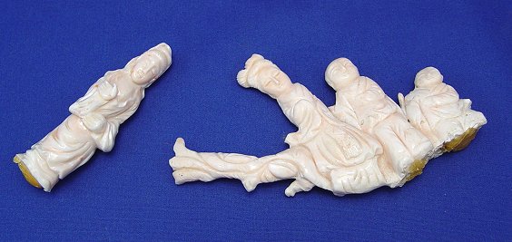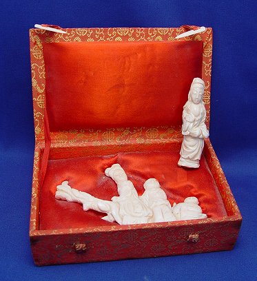 ORIENTAL CARVED CORAL FIGURES: Carved from natural coral, a grouping of three figures, 6''l, 3 1/2''h. and a figure of a woman, 3 1/2''h. The group comes in the presentation box.