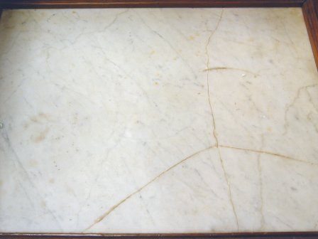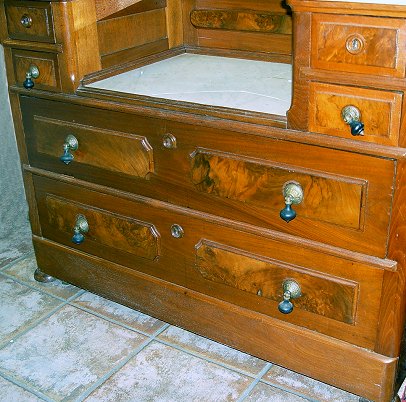 VICTORIAN RENAISSANCE REVIVAL DROP CENTER DRESSER: Burled walnut panels, white marble tops on side and center dropped surfaces. Fancy ebony drop pulls. 2 glove drawers, 2 full length drawers. 77''h. x 44''. Est. $500/600**