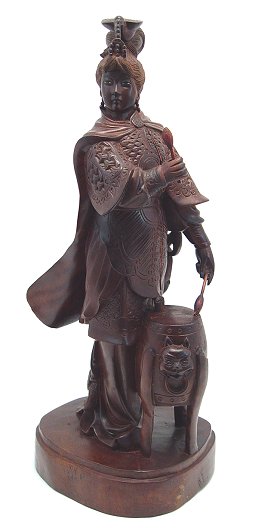 DETAILED CARVING OF ORIENTAL FIGURE WITH DRUM: Elaborate headdress and flowing cape, possibly from single piece of wood, marked to bottom ''29'', 14 1/2''h. overall, please not seperation in wood.